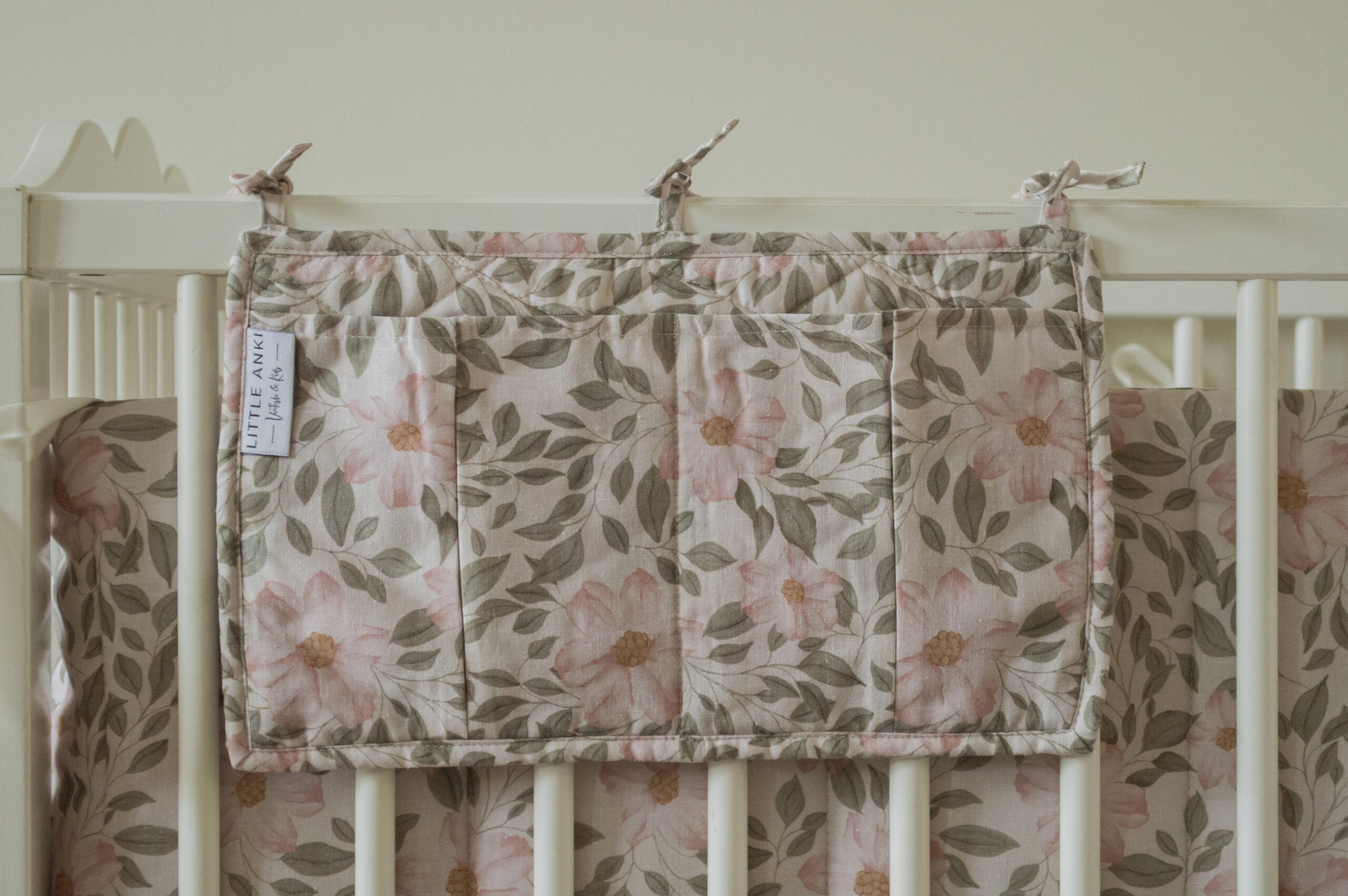 Spjälsängsfickan knyts fast på spjälsängen och är perfekt förvaring till nappar, salvor, vällingflaskan och andra smågrejer som är bra att ha nära till hands.
